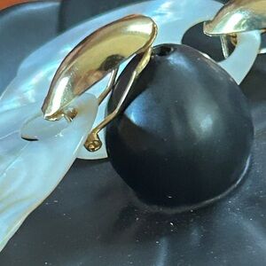 These stunning earrings feature a beautiful combination of gold and white iridescent abalone shell changes color in the light. Perfect for a night out on the town ! Pierced Gold.