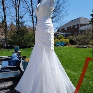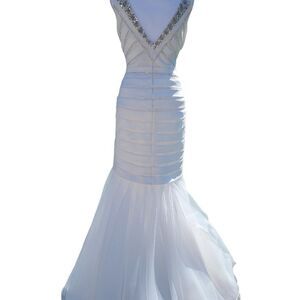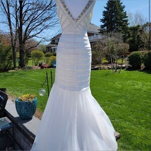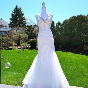 Gorgeous White Wedding Dress Prom Formal Gown Sleeveless V-Neck Fit and Flare Mermaid Fit. Flattering Pleating, Beautiful Beading, Satin Bodice with Chiffon Bottom.