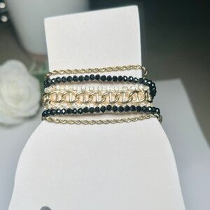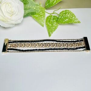 Add a stylish touch to your outfit with this gorgeous bracelet featuring gold tone chains, sparkling clear rhinestones, and black faceted beads that exudes elegance. 6.75” fit, 1.25” wide