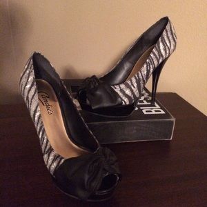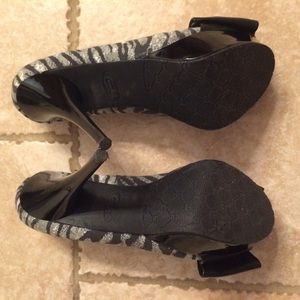 These are so sleek and sexy. They are Zebra pattern with a black flattened bow at the top with a peep toe. A 5 inch heel size 7 Med. only wore maybe twice excellent condition. 👠