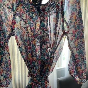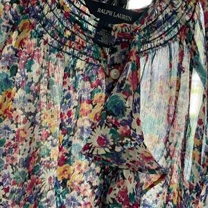 Romantic Ralph Lauren Sheer Floral dress. This beautiful and airy blouse features a delicate sheer fabric adorned with a vibrant all-over small floral print in shades of pink, yellow, blue, and green. It has a smocked or ruffled neckline, a cascading ruffled placket down the front, and long sleeves with elasticated cuffs, giving it a romantic and bohemian touch. Perfect for a flowy and feminine look!