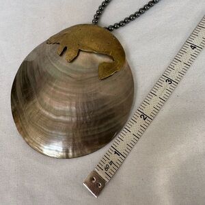 Another gorgeous necklace from my mother in laws collection. The necklace has a large polished abalone shell pendant with a carved brass manatee situated at the top of the shell. I have searched the internet to find anything close to this design and have found no other necklace even remotely like this one. The lobster claw clasp reads 925 silver.