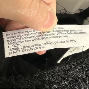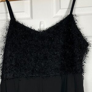 Eloquii jumpsuit in size 20. Black, dressy. Top is fitted and textured with a fun fringe type of material, and features adjustable elastic bra-type straps. The body is full and wide legged. Hidden back zip, pockets.