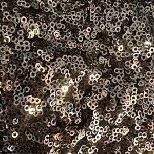 Gorgeous sequin dress – gold and black. Perfect for the holiday season or new year’s. Sheer layers of light, tulle like material make up the top, sequin bottom skirt (one piece). Backside drapes open with supporter strap linking the shoulders. Size large but runs a tad small, I’d say it’s more of a medium. Mustard Seed brand, purchased from Chicago boutique. It's flattering!