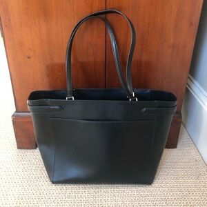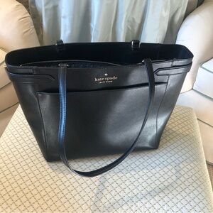 This large black leather Kate Spade tote is in excellent condition. Interior has a zippered opening at center that easily fits a 12” laptop (see pics). Room on both sides of the zippered center section for large tens such as file folders, legal pads, etc. smaller zippered enclosure on one side would fit cell phone and traditional sized wallet. Pockets on other side.