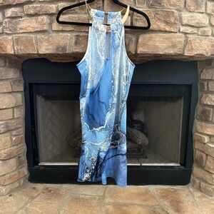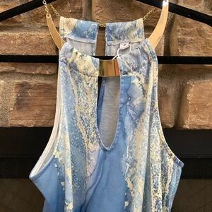 Gorgeous blue and gold racer back sundress with gold collar. Approximate measurements are 16 pit to pit and length from shoulder is 35