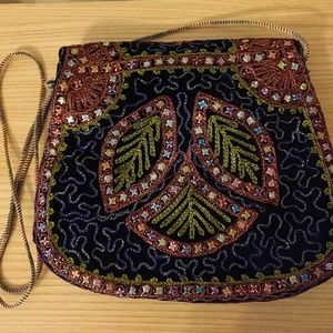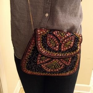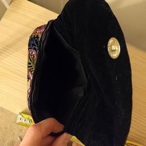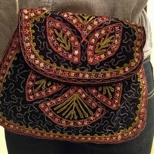 Gorgeous bohomian clutch/satchel. Simple velvet flap and cotton interior with magnetic clip. Black with purple and earthy green shimmery embroidery. Lightweight overall. The strap brings it right by the hip.
