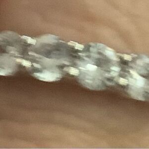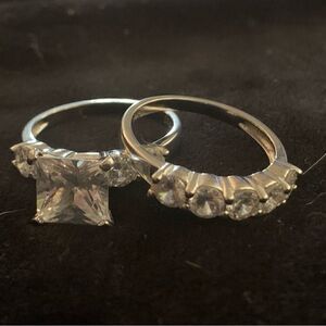 Rhodium over silver . Size 8 princess cut center stone with 2 rounds on either side . Wedding band has 5 matching rounds .