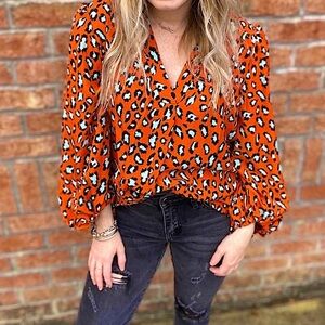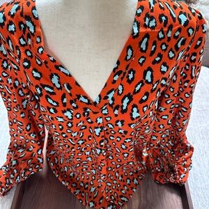 Rich orange and robins egg blue “leopard” pattern v-neck tunic top with balloon sleeves, looks great with crisp white denim or cutoffs!
