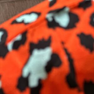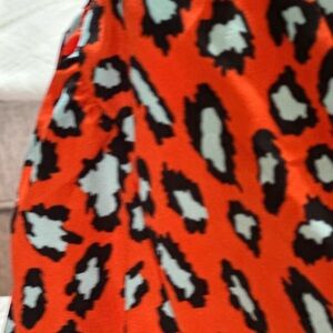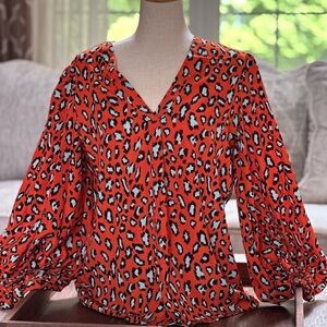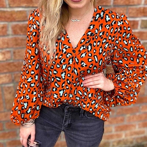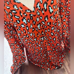 Rich orange and robins egg blue “leopard” pattern v-neck tunic top with balloon sleeves, looks great with crisp white denim or cutoffs!