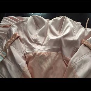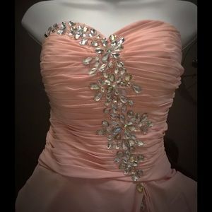 Absolutely stunning. Says size 14 but runs a little small. Fits more for 11-13. The gown has a sweetheart neckline with beading. It has a short dress that goes just about the knee under the long flowy chiffon material. Chiffon material has a slit to the bust line.This dress is absolutely gorgeous and flows beautifully as you walk. Chiffon train, corset style inside, built in bra strap hooking for a more supportive closure along with a zipper.