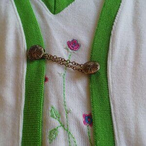 Very lovely addition for someones spring collection. I really love the unique button on the front, all though the one of them is slightly loose as noted in the last photo. Otherwise in excellent condition!