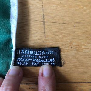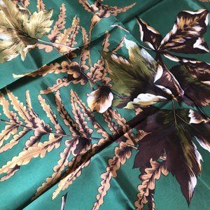 This is a beautiful vintage Hammura scarf with design with oak, maple, and elm leaves as well as ferns. The tag says it's acetate satin, water repellent, rolled edge, foreign.