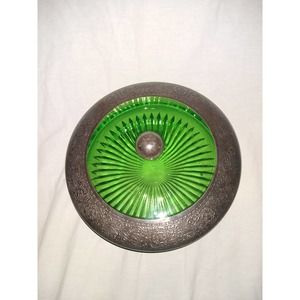 Gorgeous green depression glass covered bowl with ornate metal accented lid