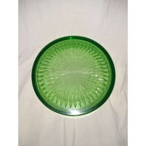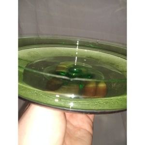 Rich, emerald green glass. 7" diameter rim to rim, 4" tall with lid. Does have a large and small chip on the inside rim of the lid (see pictures).