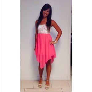 This strapless dress is a must have!!! Flowered hot pink summer time hi-low dress! Size medium!! (4-6)With stripy back!