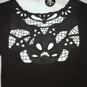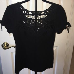 Peasant inspired top, form fitting with empire-like seam under chest. Lace borders the deep v neckline and spans across the entire back of blouse. Bows accent each sleeve. Fancy style, by feels like you're wearing a nice cotton tee.
