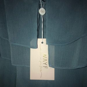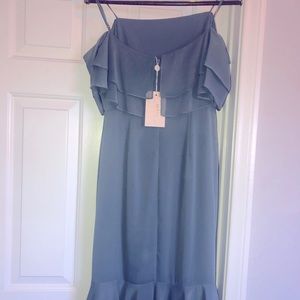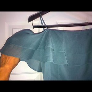 Bought at Nordstrom for a gala event but wore something else. NWT, never worn. Gorgeous blue/grey/green color and lux fabric. Tiers at bottom have generous length for someone tall or to wear with heals. Delicate ruffles off shoulder and spaghetti straps too.