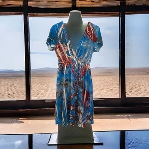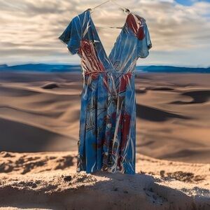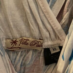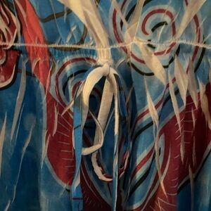This dress is so pretty. It has a low neck and back line, so I wore a bralette underneath it. No damages. Has an adjustable tie at the waist. You can also use it as a bathing suit cover up. Review all photos.