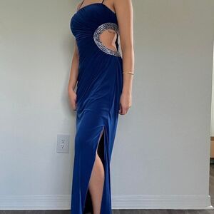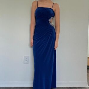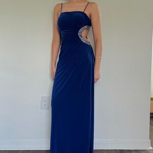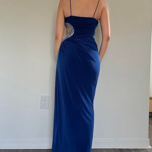 Gorgeous navy blue Cache maxi dress with beaded side cutout detail and flattering ruched bodice. Features a high slit, spaghetti straps, and body-skimming silhouette that gives early 2000s red carpet vibes. Fully lined with silky blue interior and hidden side zipper for a sleek fit.