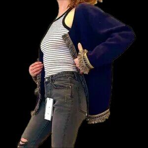 Discover a stunning women's sweater that exudes elegance and style, perfect for any occasion. This beautiful buttonless cardigan features a chic and sophisticated design, adorned with fringe-laced tassels that add a touch of glamour. The deep navy blue hue of the Chico's Neiman Marcus cardigan is simply stunning, making it a must-have addition to any fashion-savvy woman's wardrobe. In brand new condition, this sweater is ready to be worn and enjoyed right away.