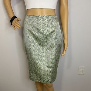 Super fun and very chic and street style neon baby green, navy blue, gray tiny graphic abstract pattern square metallic shiny mermaid like style. It’s a pencil skirt and it fitted at the waistline with a neon green exposed zipper on the side. There’s room for hips to flow and make it sexy for any size. Perfect for work or cocktails. It’s pleated in the front and back to give room for a booty and the hips. It falls to the knee and has a very fun folded over three ring ruffle on each side in the back for a flirty fun look. It’s basically brand new and I’d keep this if it fit me. The metallic shine really adds to the color and fun of this skirt. There’s a silver clip above the zipper and it’s Elie Tahari size US 8. Message for more details!