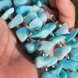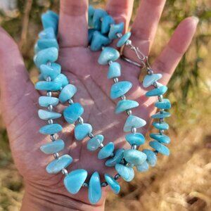 Wow! This is absolutely stunning and feels amazing on. Genuine ocean blue amazonite nuggets are strung in a graduating style with oval shaped 925 sterling silver ball beads. The stones have wonderful matrixes and variations. Two stones have a raw side, unsure if from a chip or natural, but not noticable either way...as you can see in the pictures. Called the Stone of Courage and the Stone of Truth, Amazonite empowers one to search the self and discover your own truths and integrity. It encourages us to move beyond fear of judgment or confrontation with others to live in alignment with those beliefs and values. It provides the freedom to express your thoughts and feelings. Learn to set strong and clear boundaries, both internally as self-discipline and externally as what you're willing to take and experience. Natural, beautiful patina included. May need a cleaning depending on your preferences. Tested with a neodymium magnet and JSP acid, guaranteed sterling. Check out the matching earrings I have listed!