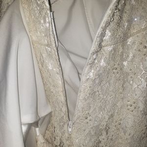 Gorgeous off white stapless beaded wedding gown. Gown is covered with lace and pearls. Strapless floor length with a modest train.