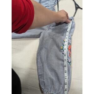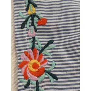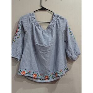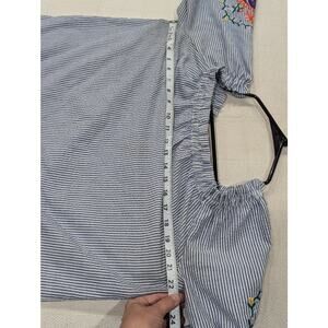 Gorgeous pinstripe off the shoulder peasant style blouse w/floral embroidery L