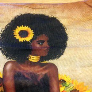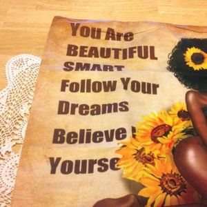 Lovely new without tags pillow cover featuring an African beauty and positive vibes statement. Please note the partial covering of a few words. I tend to think this is intentional and represents the blossoming of a powerful woman but may also be a misprint. Up to you.