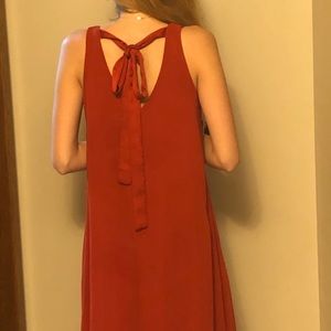 Flowy, red dress. V-neck in back with tie. Asymmetrical ruffle across front. 100% Polyester, machine washable. Only worn once! Wish it still fit!