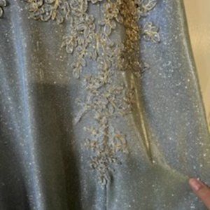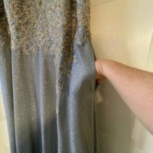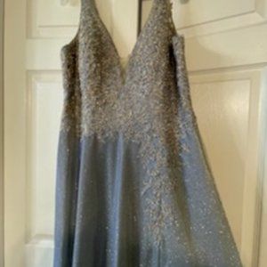 This dress is so sparkly and unique. The color lays somewhere between silver and light blue. The beading accents and across the entire top of dress as well as down the left side. Slit on left side of dress for a pop of leg. Surprising, IT HAS POCKETS. Small V-shaped mesh area in the chest area. Only worn once for approximately 2 hours. Daughter wears large/X-Large shirts and size 12/13 pants for size comparison. More beautiful in person!!