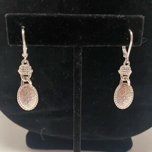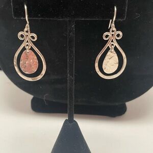 Two gorgeous pair of southwestern dangle earrings. The first pair has an Aztec print on the silver dangle. The second pair has a hammered silver dangle surrounded by a silver teardrop scroll. Great preowned condition.