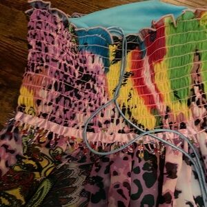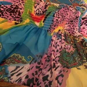 Vibrant Multi-Patterned Halter Dress. This eye-catching strapless dress features a lively combination of patterns, including leopard print and colorful paisley motifs, in a bold palette of pink, purple, blue, green, and yellow. It has a comfortable smocked bodice and thin halter straps. Perfect for a fun, eclectic, and breezy summer look!