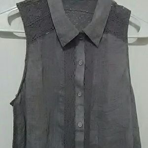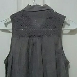 Gorgeous light & airy dark grey button up tank. The front around buttons, sides and back have a beautiful crochet design. Pocket on chest. Bought last year at Maurices and only wore once. Size Large. Excellent condition!!