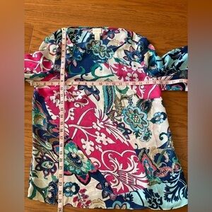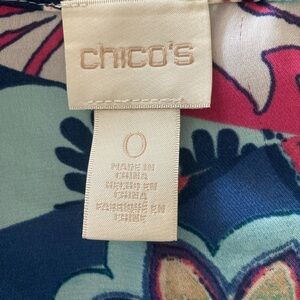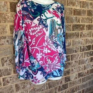 Gorgeous Chico’s size 0 bell sleeved top. Armpit to armpit measures 19”. Shoulder to hemline 25 1/2”. 100% polyester. Machine wash cold. Gently preowned condition. Bell sleeves measure 20 1/2”.