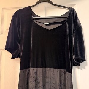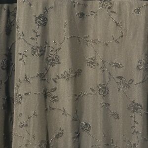 This is a like new "Formal Fashion Inc" stretch velvet and flocked chiffon roses skirt. Empire waist with velvet ribbon that. ties in the back. Pullover dress and extremely comfortable. It is made by formal fashions Inc and sell on their website right now for $85. It is a size 30. Their sizing runs to their own brand...so I have included a sizing chart. It is specked for 54" bust up to 52" waist and 58" hips. It is probably equivelant to a 4/5X. There is a lot of stretch. It has a long flowy bottom....so if you are shorter than 5'6" I wouldnt purchase...as even with heels it will probably be too long. It is a beautiful gown in fantastic condition. #formalfashionsgown #4xgown #velvetformalgown #empirewaistgown