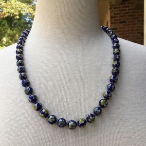 This outstanding, high-quality vintage cloisonne bead necklace measures approximately 24” long and each big 12mm bead is hand-knotted between on heavy lavender blue silk cord. These beautiful heavy metal beads have beautiful colors of pink, green, and lavender on a deep cobalt blue background. It has a gold filled oval filigree box clasp. It is all in excellent condition no damage or wear.