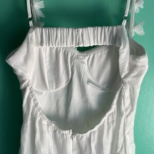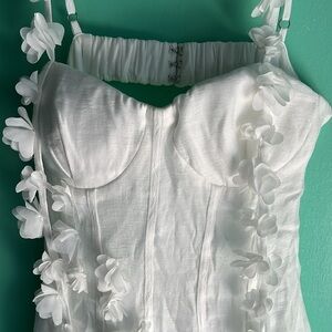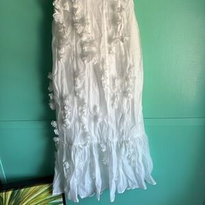 This dress is spectacular!! Never worn, purchased for a bridal shower that never happened. Padded cups, fully lined.2 strings of flowers flow with you as you walk. Ruffle bottom. Low back, back zip.Adjustable straps.Just perfect!!!