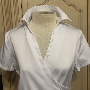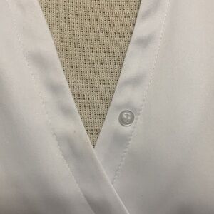 Gorgeous white blouse made of polyester and spandex has a exquisite detailing of a crisscross front with one tiny button at top of V-neck with color short sleeves on the side it shows a gathered waist line to accent your figure on back. You have a zipper from lower waist line down to him line to also Tighten and bring in a Bodycon fit gorgeous blouse has some stretch so it is very comfortable even though it looks tight