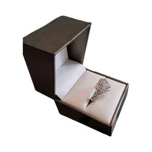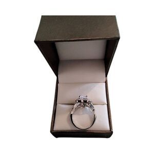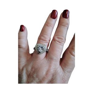 This beautiful ring features a total of five carats of the most beautiful and sparkly AAA top quality simulated diamonds. A 2 carat center heart cut stone is framed by a double halo of small round,a cut stones. The sides of the band is done in a unique crossover design. The band and setting is done in a heavy 18k white gold plate with a platinum finish. It is size 8.