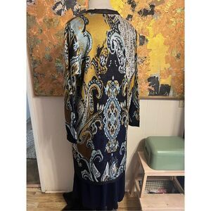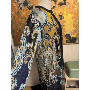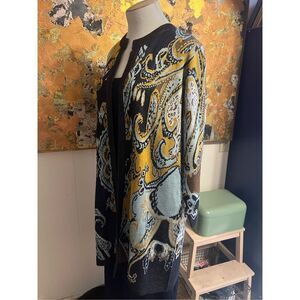 This is a gorgeous piece from Belldini a lightweight long cardigan in a beautiful paisley pattern in light blue, black and gold with touches of brown. This will jazz up just about any outfit in the cooler months! I wish this was my size. I would wear this one all the time. This is 100% acrylic and is machine washable