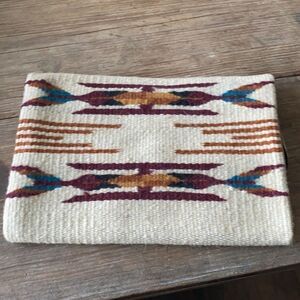 Very Roomy and has a nice lining with inside zipper compartment. Wool/Poly blend.