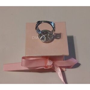 Done in 925 solid sterling silver and layered in platinum, it has a gem weight of 5.8 carats. It features a round cut prong set center stone with a Halo and stones traveling down the side shanks. It is stamped 925 for authenticity and also has the Diamonique brand stamp. It measures 1" in length by 3/4" in width. It is size 8. It will come in a gift box, but not this pink one.