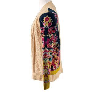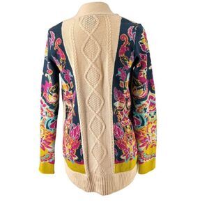 Turn heads in this unique Flying Tomato open-front cardigan! Featuring a beautiful beige cable knit body paired with eye-catching colorblock sleeves in rich navy, mustard, fuchsia, and teal with a vibrant floral pattern. This sweater is a wearable piece of art!