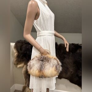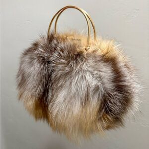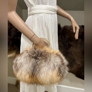 Only one available. Handmade from premium genuine Fox fur, exquisite metal frame with top handle. This fur is quite long, fluffy and dense, with a full fur cover design.