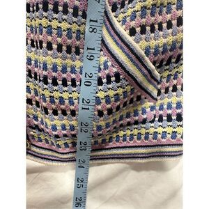 Gorgeous St. John multicolored cardigan and tank top set, size small and the tank top is size P. The cardigan has buttons and is a wool blend. The cardigan has a small stain on the sleeve (see pictures). The set is a wool blend, but lightweight. Perfect for any occasion.
