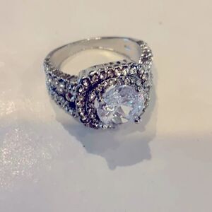 Beautiful sterling silver halo ring with large center stone surrounded by two rows of smaller stones with three rows down each side. Size 6.