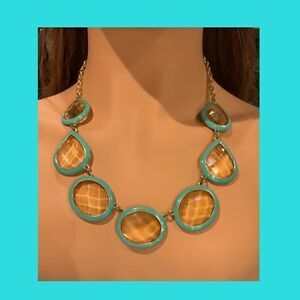 Absolutely beautiful statement necklace with large beautifully cut clear resin crystals surrounded by beautiful turquoise blue edge in gold tone setting. This piece definitely makes a statement and is sure to turn heads.q