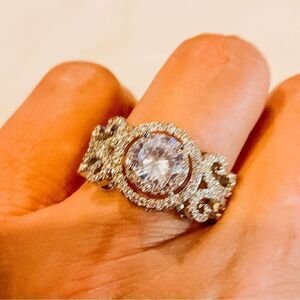 Beautiful new silver CZ wedding band in a lovely scroll design with a large center stone surrounded by scrolls covered in CZ’s. Look like a fortune but don’t spend it. Size 8.